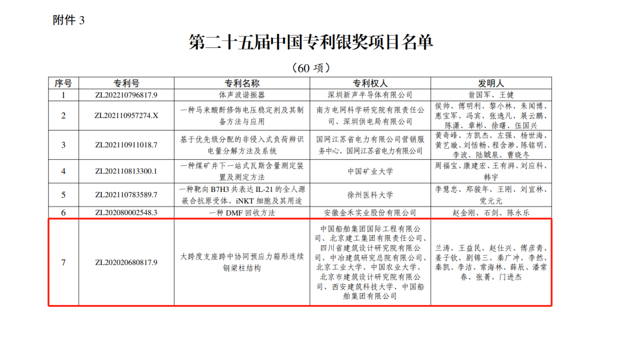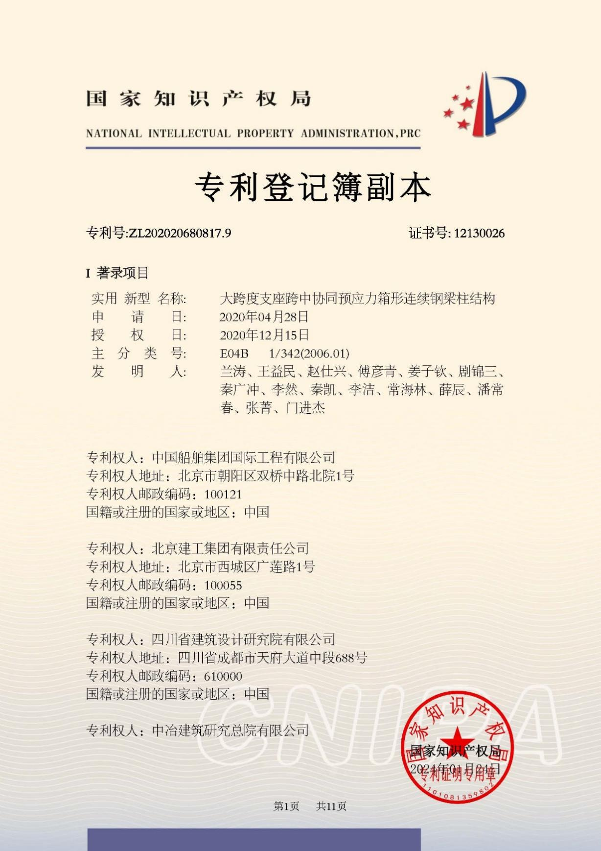今年6月,國家知識產(chǎn)權(quán)局公布第二十五屆中國專利獎授獎決定,由中船集團(tuán)旗下中船國際工程主導(dǎo)申報的專利《大跨度支座跨中協(xié)同預(yù)應(yīng)力箱形連續(xù)鋼梁柱結(jié)構(gòu)》(專利號:ZL202020680817.9)榮獲本屆中國專利銀獎。該獎項(xiàng)由國家知識產(chǎn)權(quán)局與世界知識產(chǎn)權(quán)組織聯(lián)合設(shè)立,是我國專利領(lǐng)域的最高榮譽(yù)。今天,讓我們走進(jìn)中船國際工程鋼結(jié)構(gòu)工程設(shè)計與研發(fā)團(tuán)隊,聆聽他們的奮斗故事。