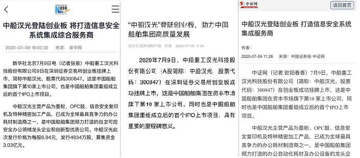 中船漢光成功上市在業(yè)內(nèi)引起強(qiáng)烈反響,新華社、經(jīng)濟(jì)日報(bào)以及中國證券報(bào)等主流媒體紛紛進(jìn)行了報(bào)道。