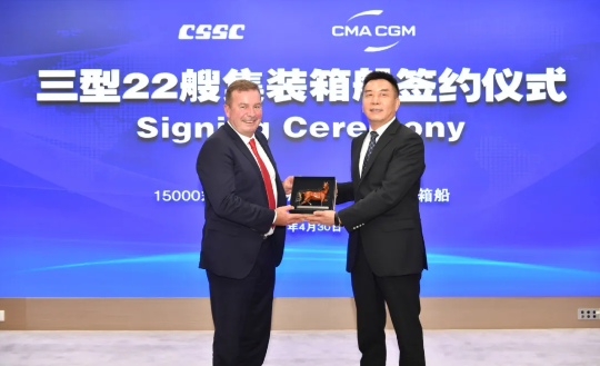 4月30日,中國船舶集團旗下中船貿易攜手江南造船、滬東中華、北船重工聯(lián)合承接法國達飛海運集團3型22艘集裝箱船訂單,中國船舶集團黨組成員、副總經(jīng)理孫偉,達飛集團執(zhí)行副總裁澤維爾出席簽約儀式。