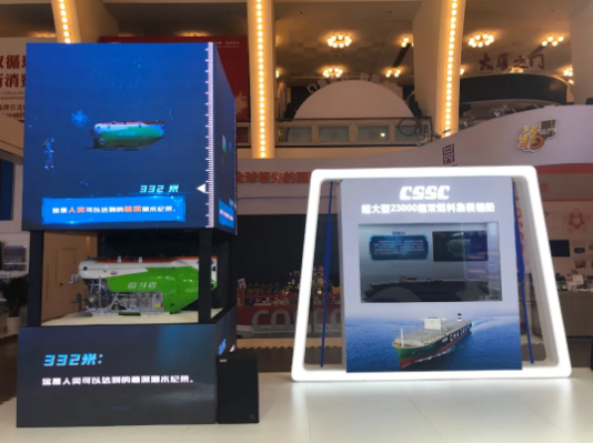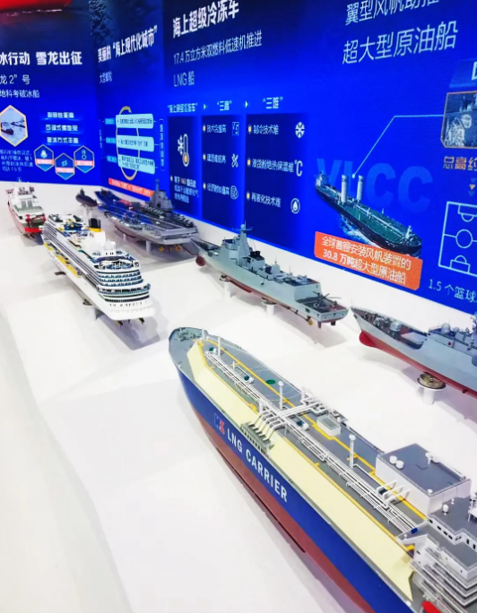 進(jìn)入中國船舶展廳,觀眾不僅能夠看到“奮斗者”號全海深載人潛水器、“雪龍2”號極地科考船等多個高科技品牌產(chǎn)品,還可以通過航空母艦、常規(guī)動力潛艇、驅(qū)逐艦、護(hù)衛(wèi)艦?zāi)P土私馕覈鴩姥b備實(shí)力。