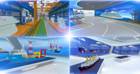 云展廳運用360度全景3D建模、沉浸式場景以及實時渲染等領先創(chuàng)新技術(shù),打造了高端3A(“Anybody、Anytime、Anywhere”)展示平臺,特別是以實景還原的場景,動態(tài)展示大型郵輪、液化天然氣(LNG)船、雪龍2號、奮斗者號等亮點產(chǎn)品,為參觀者營造了身臨其境的逼真效果。