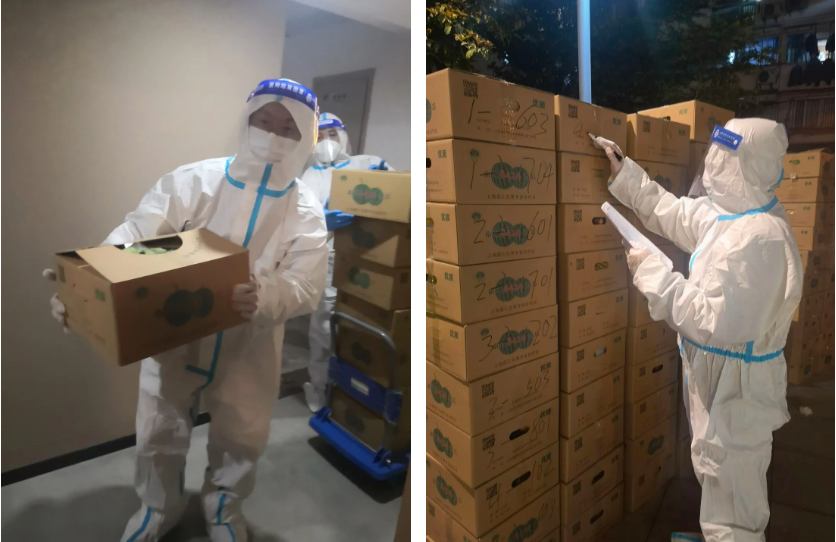 由于防護(hù)服有限,居住在黃浦區(qū)某社區(qū)的集團(tuán)職工中只有鄭珂成了志愿者,只見他時(shí)而忙著卸貨分裝,時(shí)而忙著打包標(biāo)記,7棟樓近400戶居民共計(jì)幾百公斤的物資,都由他一人完成了分裝和標(biāo)記工作。在他服務(wù)的對(duì)象中,既有身在涉疫樓棟無(wú)法出戶的同事,也有素未謀面的鄰居。