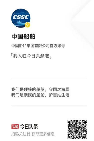 繼中國船舶官方抖音號之后,中國船舶官方頭條號今天也正式開通!