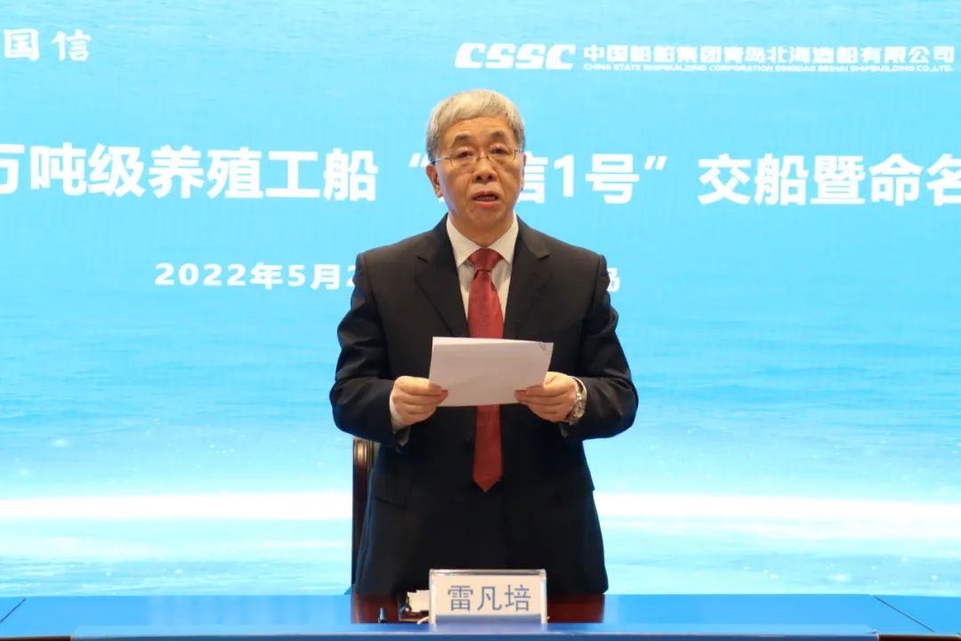 雷凡培在致辭中表示,中國(guó)船舶集團(tuán)作為我國(guó)船舶工業(yè)的骨干力量和海洋裝備發(fā)展的引領(lǐng)力量,一直將推動(dòng)我國(guó)高端海洋漁業(yè)裝備建設(shè)和助力我國(guó)深遠(yuǎn)海養(yǎng)殖產(chǎn)業(yè)發(fā)展作為重要使命和責(zé)任。2019年,中國(guó)船舶集團(tuán)向中央提出開(kāi)展深遠(yuǎn)海養(yǎng)殖示范工程等建議,得到了中央領(lǐng)導(dǎo)批示和國(guó)家有關(guān)部委的大力支持。本次交付的養(yǎng)殖工船項(xiàng)目,是中國(guó)船舶集團(tuán)落實(shí)國(guó)家深遠(yuǎn)海養(yǎng)殖示范工程的重要舉措,也是貫徹落實(shí)國(guó)家海洋強(qiáng)國(guó)戰(zhàn)略、服務(wù)生態(tài)文明建設(shè)和維護(hù)國(guó)家糧食安全的具體實(shí)踐?!皣?guó)信1號(hào)”是全球首艘10萬(wàn)噸級(jí)養(yǎng)殖工船,集深海養(yǎng)殖先進(jìn)經(jīng)驗(yàn)、現(xiàn)代化環(huán)保養(yǎng)殖理念和海洋工程裝備尖端技術(shù)于一身,跨領(lǐng)域集成創(chuàng)新,實(shí)現(xiàn)了全球深遠(yuǎn)海漁業(yè)大型智能養(yǎng)殖裝備的重大突破,創(chuàng)造了養(yǎng)殖漁船單船噸位最大、單船養(yǎng)殖規(guī)模最大、單艙水體量最高等多項(xiàng)國(guó)內(nèi)外紀(jì)錄,開(kāi)創(chuàng)了智慧養(yǎng)殖新模式,其前瞻性、引領(lǐng)性、創(chuàng)新性向世界提供了深遠(yuǎn)海養(yǎng)殖的“中國(guó)方案”。