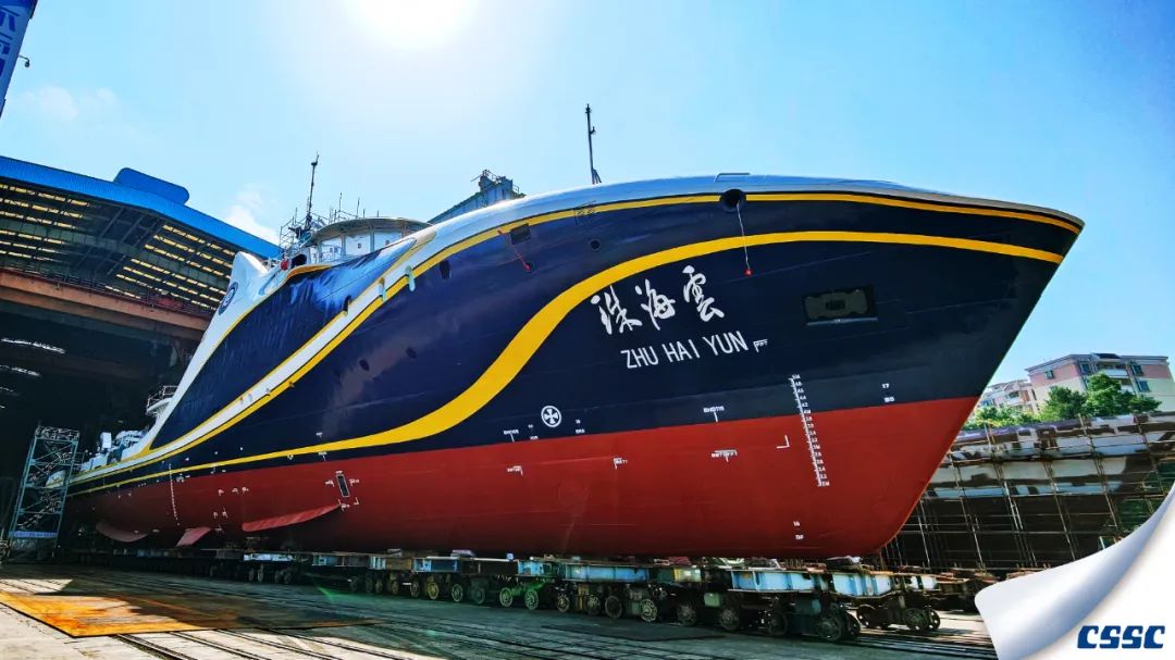 黃埔文沖建造的全球首艘智能型無人系統(tǒng)科考船“珠海云”號下水。這科幻的外表又似一頭巨大的鯨魚躍出海面。
