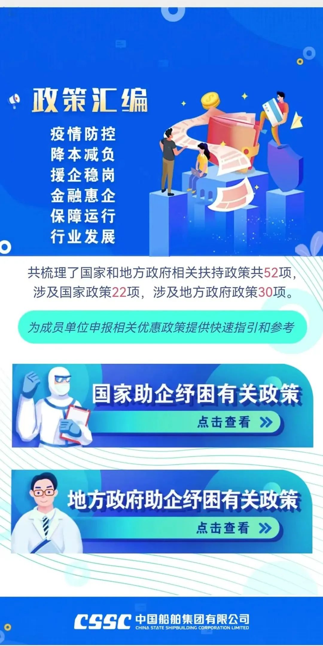 今年新冠疫情發(fā)生以來,為支持企業(yè)應(yīng)對(duì)疫情防控、加快復(fù)工達(dá)產(chǎn),國務(wù)院、相關(guān)部門、相關(guān)地方政府出臺(tái)了一系列助企紓困政策。集團(tuán)公司對(duì)這些政策進(jìn)行了梳理,共涉及相關(guān)支持政策52項(xiàng)(其中,國家支持政策22項(xiàng)地方支持政策30項(xiàng)),供成員單位查閱參考。