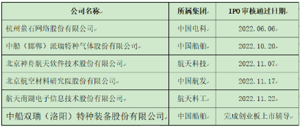 2022年的資本市場,行情不熱行業(yè)熱。從已經(jīng)公開披露的信息看,2022年中央企業(yè)專精特新小巨人在科創(chuàng)板和創(chuàng)業(yè)板持續(xù)發(fā)力,目前已有中無人機(航空工業(yè))、國博電子(中國電科)、振華風光(中國電子)、昆船智能等7家企業(yè)IPO上市。此外,截至2022年11月30日,已有多家央企專精特新企業(yè)IPO申請通過了科創(chuàng)板上市委審核和創(chuàng)業(yè)板上市輔導,其中有兩家中國船舶集團旗下企業(yè)(見下表)。這些企業(yè)將在2023年IPO上市,主要來自船舶、航空、航天和軍工電子行業(yè)。