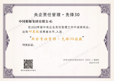 2022年12月20日,由國務(wù)院國資委社會責(zé)任局主辦、中國社會責(zé)任百人論壇承辦的“新征程 新責(zé)任——《中央企業(yè)社會責(zé)任藍(lán)皮書(2022)》《國資國企社會責(zé)任藍(lán)皮書(2022)》發(fā)布活動”在京舉行?;顒右浴霸贫藭h”的方式舉辦,發(fā)布了“央企責(zé)任管理 · 先鋒30指數(shù)”,中國船舶集團入選該指數(shù)。