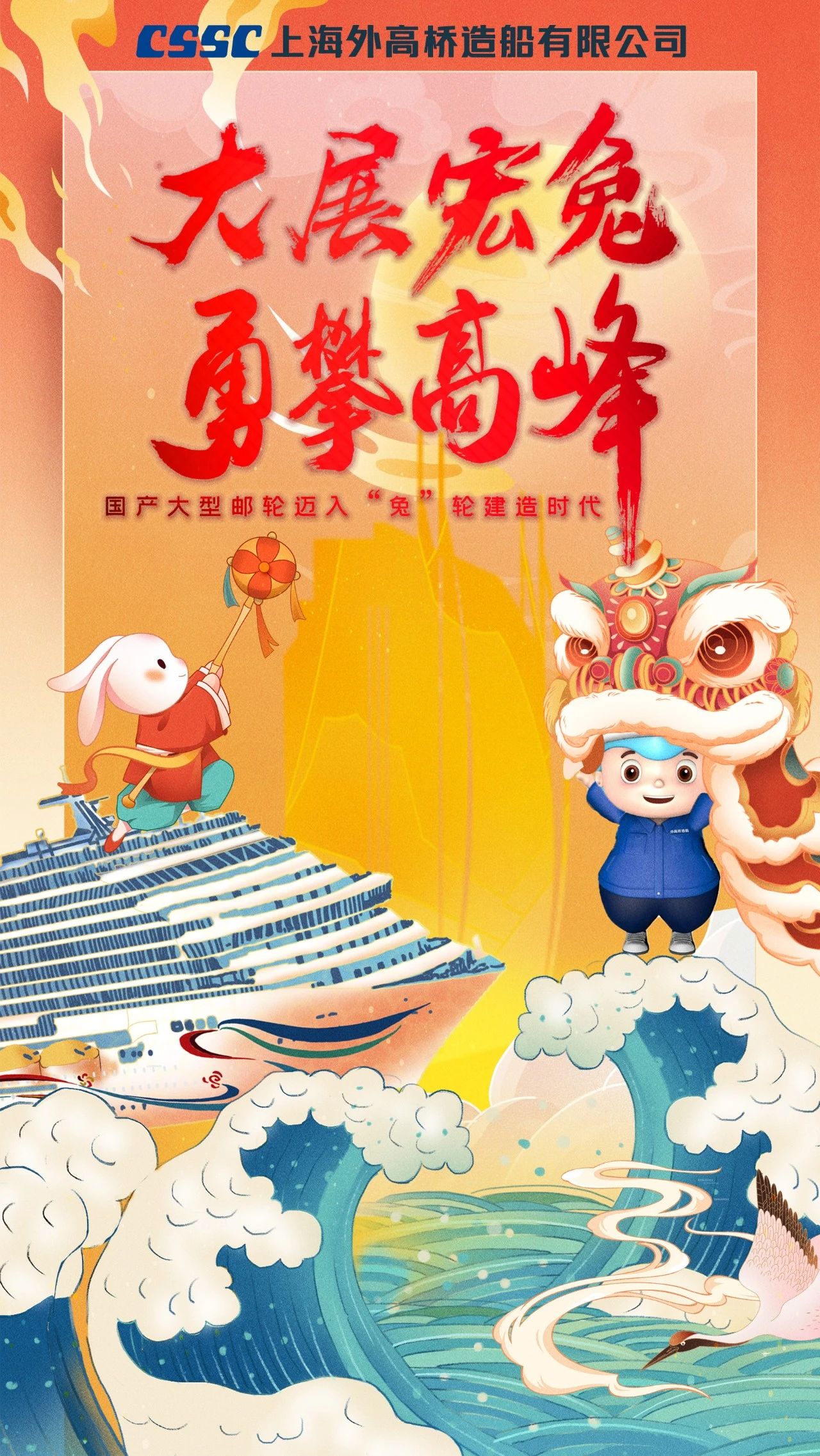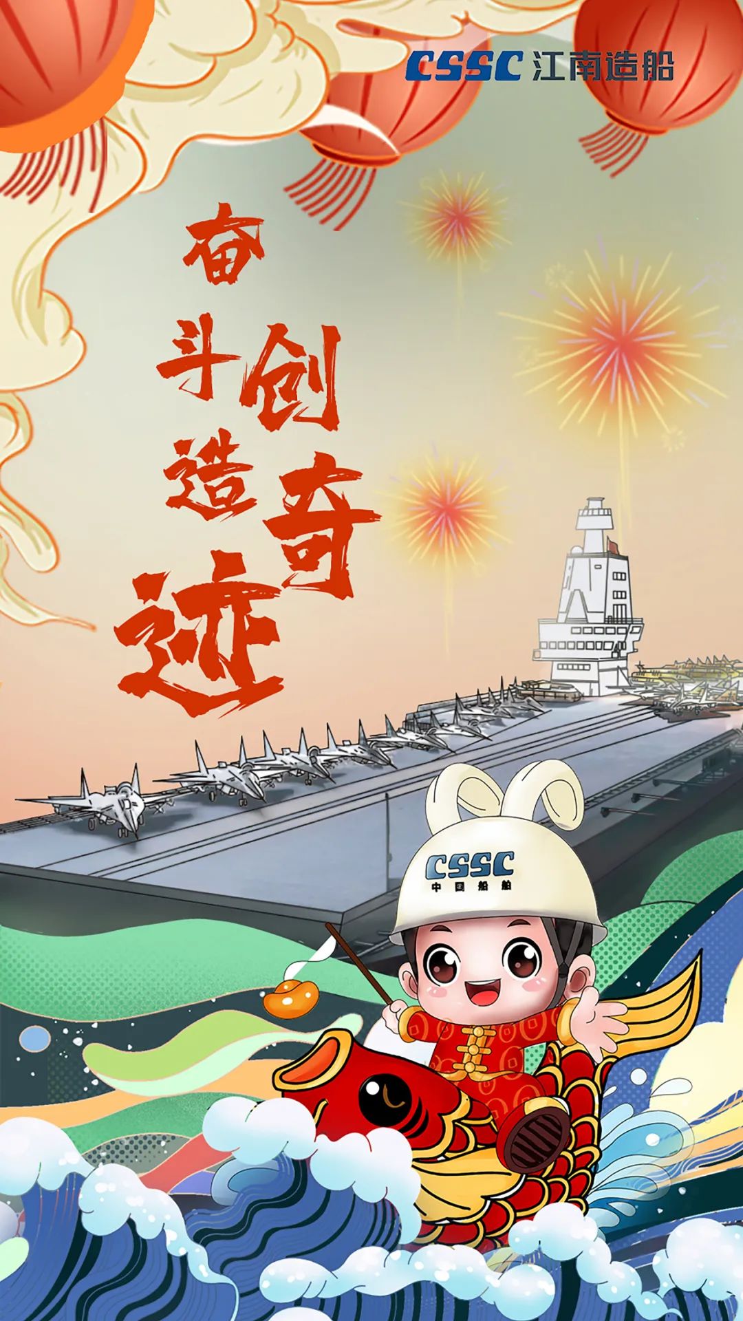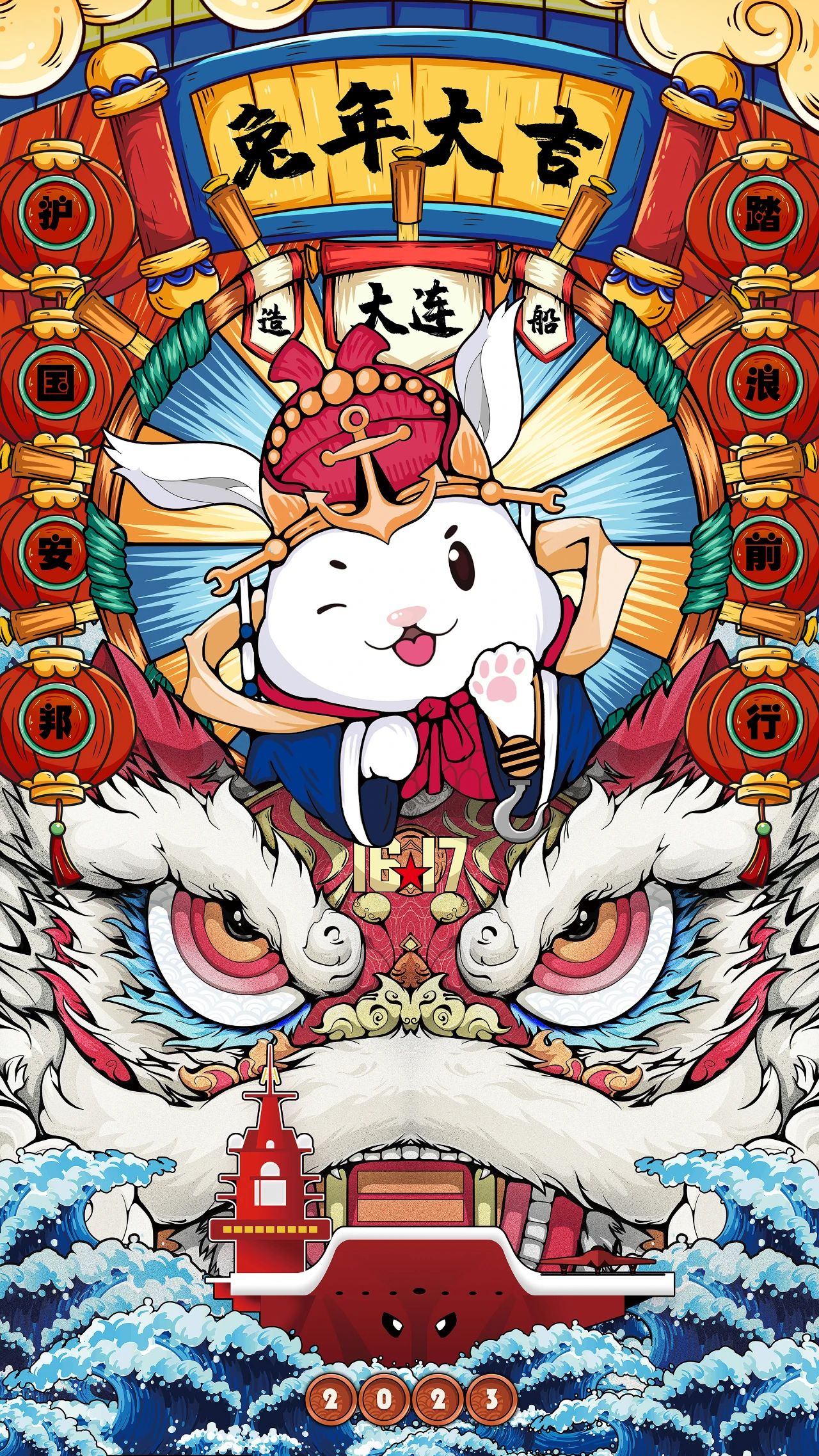 海報中所展現(xiàn)的元素,皆由大連造船元素組成,中間癸卯兔的頭冠裝飾以船錨、舵軸為主,下方航母在海中追風(fēng)逐浪,象征大連造船必將在新時代發(fā)展中踏浪前行。