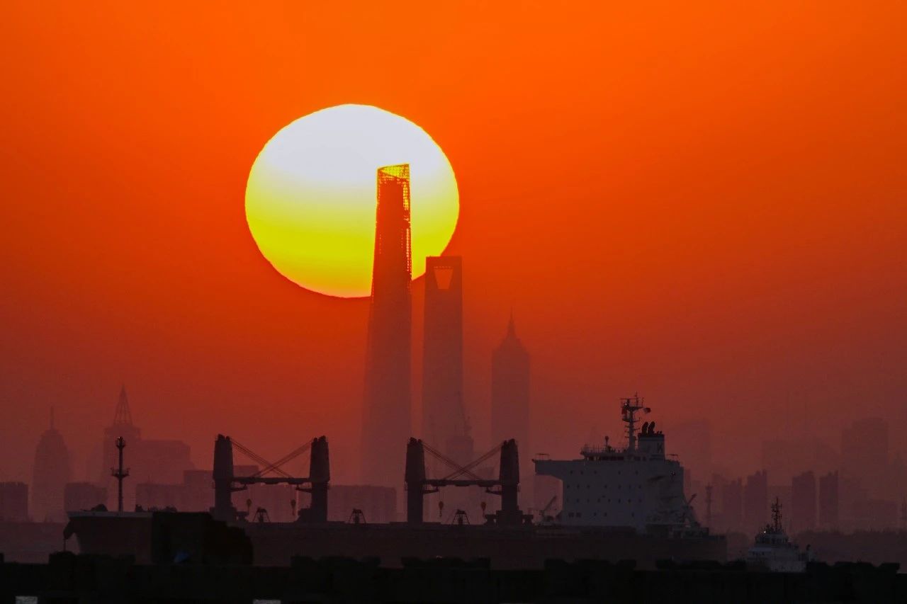 從距離陸家嘴33公里遠的橫沙島上遠眺“三件套”,夕陽從“三件套”穿過,此時一艘船駛?cè)氘嬅?,與夕陽形成近中遠三景。