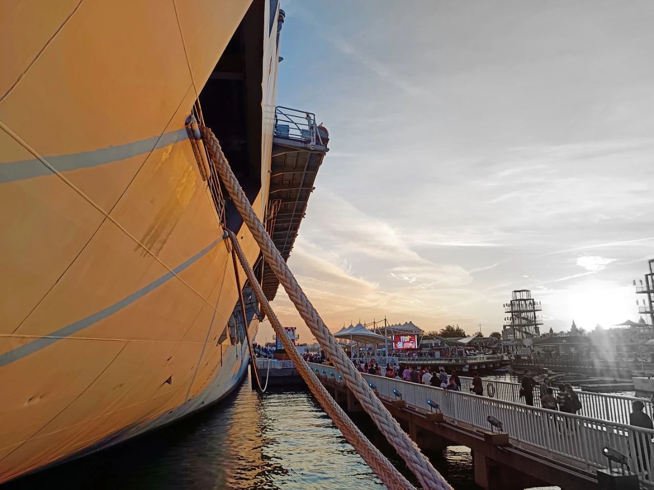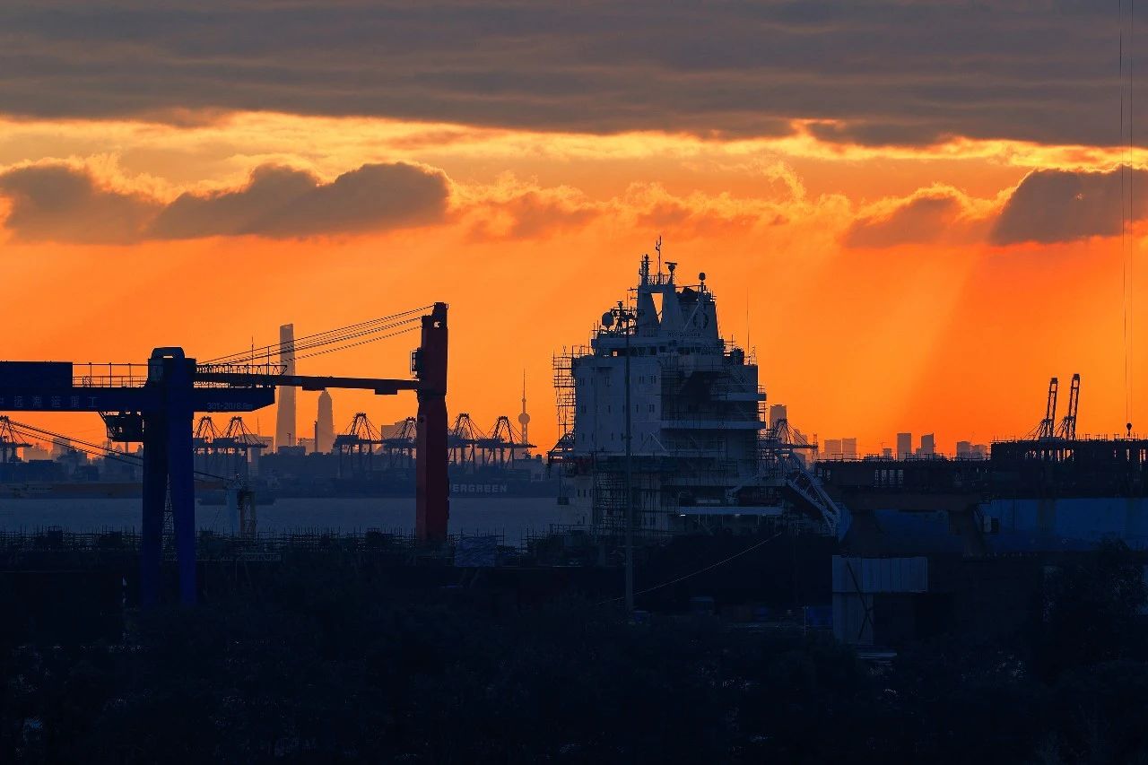 落日余暉下,造船現(xiàn)場燈火通明,展現(xiàn)出一派繁忙景象。在五彩斑斕的晚霞襯托下,整個造船基地猶如寶石般熠熠生輝。