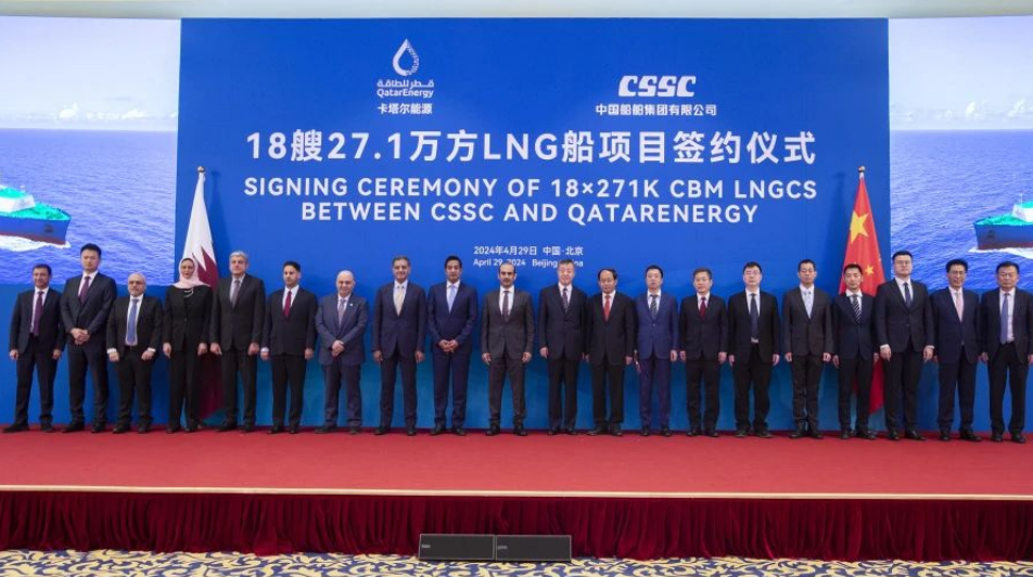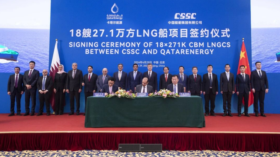 4月29日,中國(guó)船舶集團(tuán)有限公司與卡塔爾能源在京舉行18艘全球最大27.1萬(wàn)立方米超大型液化天然氣(LNG)運(yùn)輸船項(xiàng)目簽約儀式。工業(yè)和信息化部副部長(zhǎng)單忠德,外交部西亞北非司大使呂健,中國(guó)船舶集團(tuán)董事長(zhǎng)溫剛、副總經(jīng)理盛紀(jì)綱,卡塔爾能源事務(wù)國(guó)務(wù)大臣、卡塔爾能源總裁兼首席執(zhí)行官薩阿德·謝里達(dá)·阿爾卡比,卡塔爾能源天然氣首席執(zhí)行官卡利德·阿爾-塞尼,卡塔爾能源商務(wù)和業(yè)務(wù)發(fā)展執(zhí)行副總裁賈西姆·阿爾馬拉祖齊等領(lǐng)導(dǎo)和嘉賓出席簽約儀式。