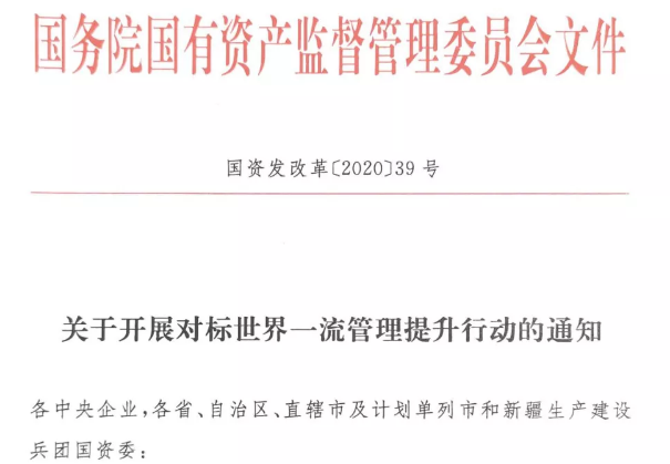 6月13日,國資委正式印發(fā)《關(guān)于開展對(duì)標(biāo)世界一流管理提升行動(dòng)的通知》(以下簡稱《通知》),對(duì)國有重點(diǎn)企業(yè)開展對(duì)標(biāo)提升行動(dòng)作出部署安排。
