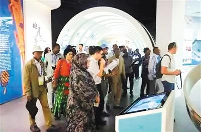 來自非洲12個(gè)發(fā)展中國家基礎(chǔ)設(shè)施建設(shè)及規(guī)劃相關(guān)部門的高級官員在徐工集團(tuán)展廳內(nèi)參觀。