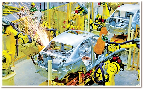 日前,記者在東風(fēng)汽車(chē)公司旗下神龍汽車(chē)公司成都工廠焊裝車(chē)間看到,占地面積約10個(gè)足球場(chǎng)的車(chē)間儼然就是一個(gè)“機(jī)器人王國(guó)”:442臺(tái)各種機(jī)器人都在忙碌著,所有點(diǎn)焊、弧焊、激光焊、螺柱焊、涂膠、包邊、鉚接、部件搬運(yùn)等“重活、累活”全部由機(jī)器人自動(dòng)完成。焊裝分廠廠長(zhǎng)孫繼勝介紹說(shuō),除442臺(tái)機(jī)器人外,車(chē)間還有另外一個(gè)“撒手锏”??六面體轉(zhuǎn)臺(tái)設(shè)備?!霸瓉?lái)生產(chǎn)1個(gè)車(chē)型要建6條生產(chǎn)線(xiàn),現(xiàn)在1條生產(chǎn)線(xiàn)就可以生產(chǎn)6種車(chē)型?!睂O繼勝說(shuō)。