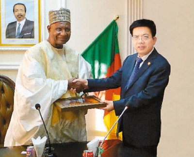 陜西建工集團(tuán)黨委書(shū)記、董事長(zhǎng)、總經(jīng)理張義光(右)拜會(huì)喀麥隆旅游部長(zhǎng)貝洛?布巴?邁加里先生(藺進(jìn)士 攝)