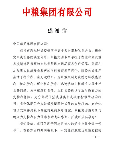 ????在這場戰(zhàn)“疫”中,中國船舶集團沒有缺席——所屬八院鵬力科技集團緊急承擔(dān)平面口罩機、N95口罩機、壓條機等醫(yī)療物資生產(chǎn)關(guān)鍵設(shè)備研制攻關(guān)任務(wù),以“戰(zhàn)時速度”硬核抗疫。近日,中國石油、中糧集團、中國誠通集團等,紛紛發(fā)來感謝信,對鵬力科技集團的全力支持表達深深的謝意。