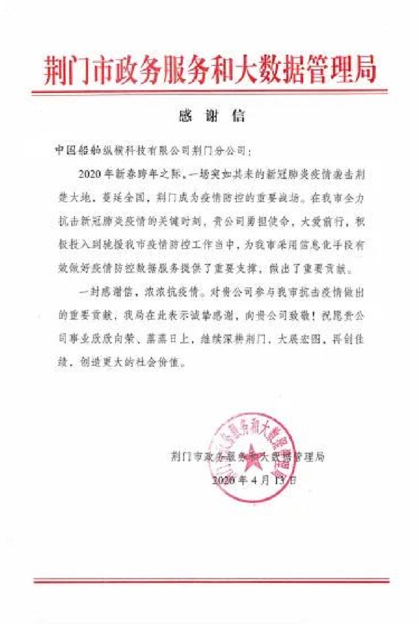 ????中國(guó)船舶集團(tuán)七一〇所縱橫公司荊門(mén)分公司收到荊門(mén)市政務(wù)服務(wù)和大數(shù)據(jù)管理局寄來(lái)的感謝信,感謝其在抗擊新冠肺炎疫情的關(guān)鍵時(shí)刻,為荊門(mén)市采用信息化手段有效做好疫情防控?cái)?shù)據(jù)服務(wù)提供了重要支撐,作出了重要貢獻(xiàn)。