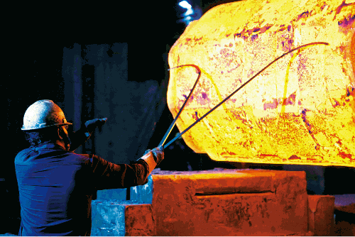 剛出爐的火紅鍛件,在臉上映出一片紅光,武漢重工鍛工師傅正站在壓機前指揮操作。