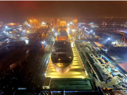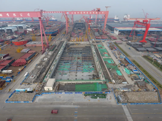 ——第二次改造,2018年10月至2020年6月,再次接長200米,建成后總長達(dá)740米。通過中間塢門分別形成前后兩個獨(dú)立塢室,以滿足年產(chǎn)1.5艘大型郵輪及3艘VLCC綱領(lǐng)產(chǎn)品要求。