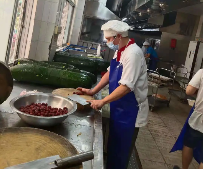 而在技校和養(yǎng)老院的后廚,阮積劍等廚師們同樣已經(jīng)整裝待發(fā)。在社區(qū)封閉初期,飲食服務(wù)部養(yǎng)老院飯?zhí)脝T工由原來的18人劇減至7人。廚師梁志寬面對每日約800人的進(jìn)餐人數(shù),迎難而上,轉(zhuǎn)變菜式花樣,合理優(yōu)化膳食,注重營養(yǎng)搭配,以嫻熟的廚藝獨自完成后廚大量工作,保證了菜肴準(zhǔn)時出品。而廚師、黨員陳兆銘得知飯?zhí)靡蚴芤咔橛绊懚耸謬?yán)重不足,在試航歸來做完核酸檢測后立即回到養(yǎng)老院飯?zhí)玫膷徫簧?。為此,他直接把“家”安在了養(yǎng)老院,每天睡在簡易折疊床上。