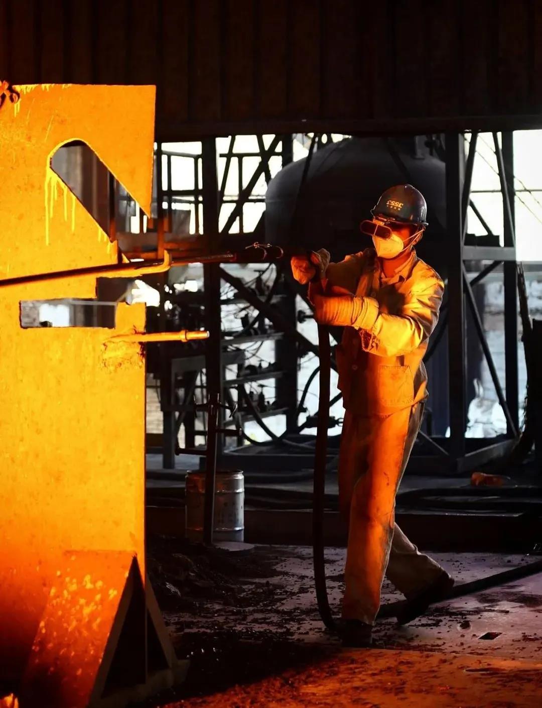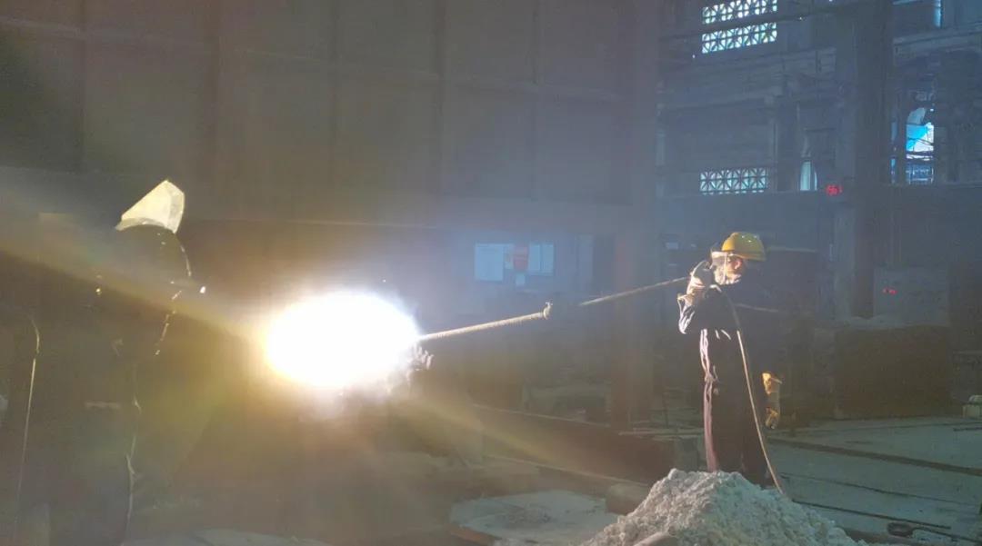 煉鋼工人為確保鋼水質(zhì)量,提高生產(chǎn)效率進行吹氧工序,鋼水溫度達1600余攝氏度。