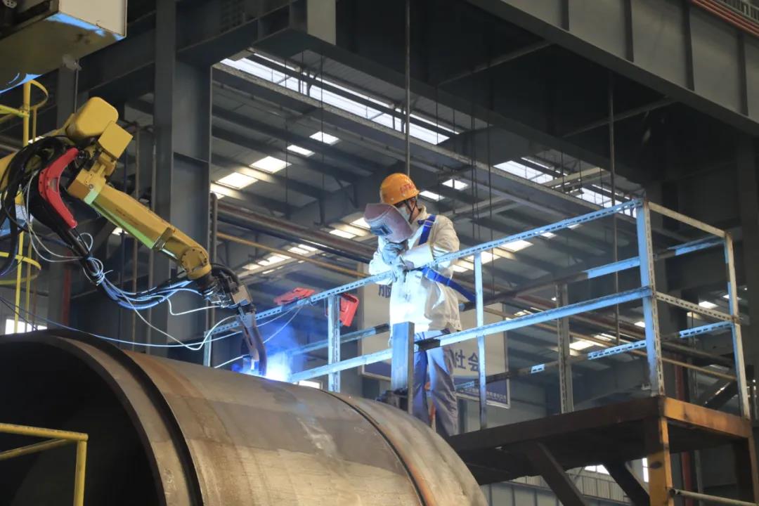 武漢船機鋼構(gòu)制造部員工正在操作焊接機器人焊接海工產(chǎn)品結(jié)構(gòu)件。