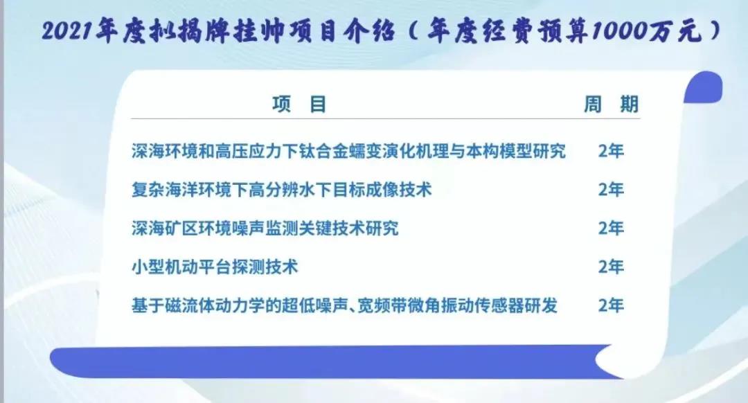 本次5個(gè)揭榜掛帥項(xiàng)目分別為:深海環(huán)境和高壓應(yīng)力下鈦合金蠕變演化機(jī)理與本構(gòu)模型研究、復(fù)雜海洋環(huán)境下高分辨水下目標(biāo)成像技術(shù)、深海礦區(qū)環(huán)境噪聲監(jiān)測(cè)關(guān)鍵技術(shù)研究、小型機(jī)動(dòng)平臺(tái)探測(cè)技術(shù)、基于磁流體動(dòng)力學(xué)的超低噪聲、寬頻帶微角振動(dòng)傳感器研發(fā)。