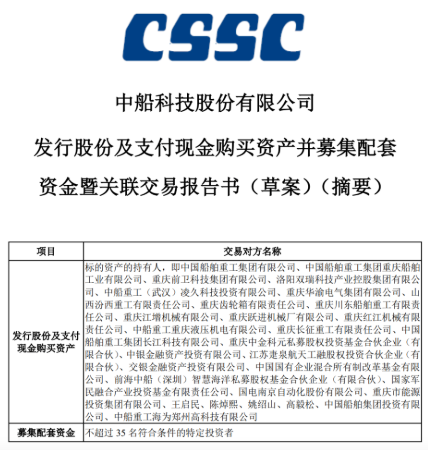 據了解,中船科技于9月30日召開了第9屆董事會第12次會議,審議通過了《發(fā)行股份及支付現(xiàn)金購買資產并募集配套資金暨關聯(lián)交易報告書(草案)》等相關議案。