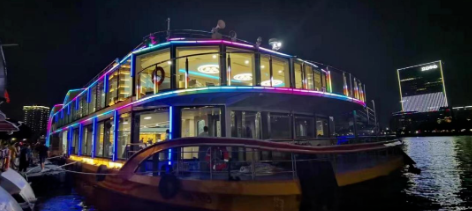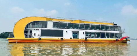 “廣游19”配置3015kWh純鋰電池驅(qū)動(dòng),Z形全回轉(zhuǎn)舵槳推進(jìn),經(jīng)濟(jì)航速下可滿足7小時(shí)續(xù)航要求。船體上建采用大面積玻璃幕墻,具有開闊的觀光視野,可360度觀賞珠江日景夜景,可提供江景游覽、娛樂餐飲、會(huì)議招待、婚禮、音樂舞會(huì)、年會(huì)等綜合服務(wù)。