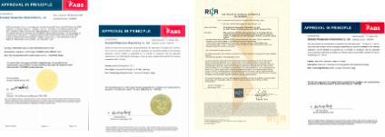 從左至右依次為21萬噸紐卡斯?fàn)栃图状既剂蟿?dòng)力散貨船、9200車雙燃料動(dòng)力汽車運(yùn)輸船(PCTC)、創(chuàng)新型30萬噸原油輪(VLCC)、115萬載重噸氨燃料油輪的AIP證書