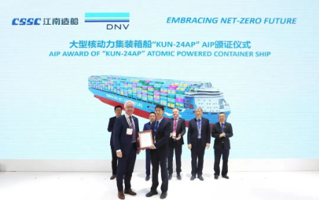全球首型、世界最大24000箱核動力集裝箱船船型發(fā)布,挪威船級社(DNV)頒發(fā)了該船型的原則性認(rèn)可證書。