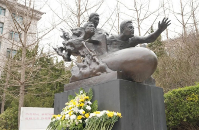 在時代楷?!た篂?zāi)搶險英雄雕像前默哀