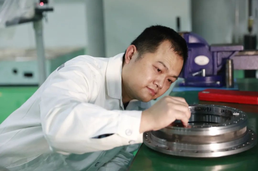 “必須持之以恒地以精益求精、精雕細(xì)琢的工匠精神打造所經(jīng)手的每個(gè)產(chǎn)品!”這是周虎常提的一句話。燃?xì)廨啓C(jī)機(jī)匣零組件制造精度要求高,裝配質(zhì)量控制嚴(yán),其加工、裝配工藝技術(shù)代表機(jī)械制造行業(yè)的先進(jìn)水平。武漢船機(jī)首套燃?xì)廨啓C(jī)機(jī)匣產(chǎn)品裝配工作由周虎帶領(lǐng)班組成員進(jìn)行,其高超的技能水平保障了產(chǎn)品的裝配質(zhì)量與進(jìn)度。在25兆瓦燃?xì)廨啓C(jī)過渡段機(jī)匣葉片裝配過程中,因葉片與機(jī)匣外環(huán)裝配為燕尾槽式的榫接結(jié)構(gòu),葉片榫頭與燕尾榫槽三面的接觸面積要求高達(dá)80%以上,需由鉗工拂配以達(dá)該指標(biāo)。葉片榫頭拂配過程中,周虎采用銼刀銼削裝配面,利用其長(zhǎng)期磨練掌握的良好手感,將銼削量誤差控制在0.005-0.01毫米,大大減少了葉片試裝配次數(shù),裝配效率顯著提升。