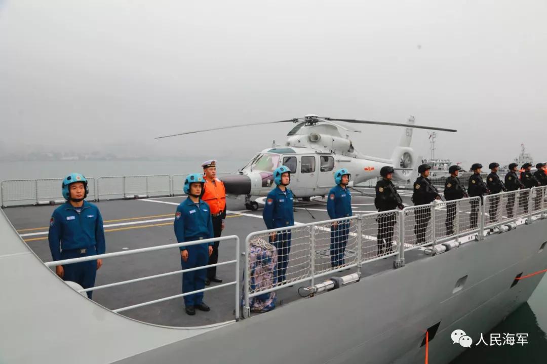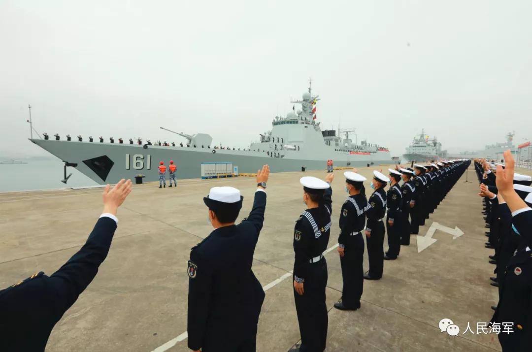 軍樂隊奏響《歡送進行曲》,編隊艦艇依次解纜,緩緩駛離碼頭,任務官兵整齊列隊、士氣高昂,向祖國和人民揮手告別。