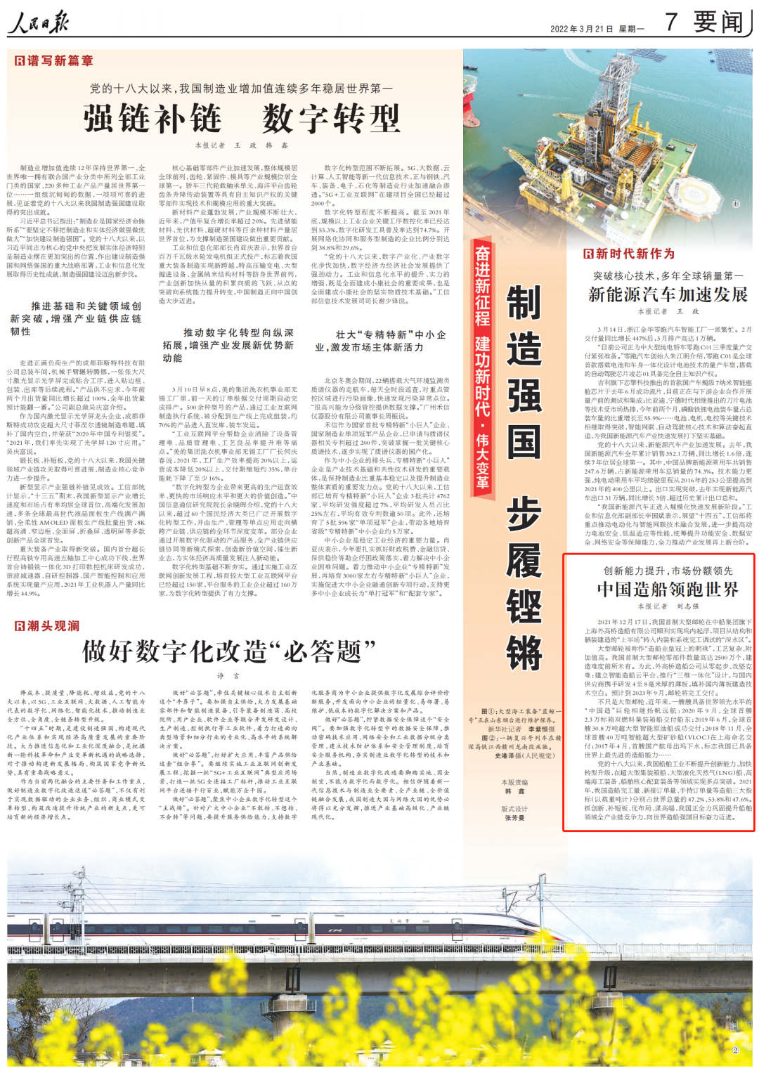 黨的十八大以來(lái),我國(guó)船舶工業(yè)不斷提升創(chuàng)新能力、加快轉(zhuǎn)型升級(jí),在超大型集裝箱船、大型液化天然氣(LNG)船、高端海工裝備、船舶核心配套裝備等領(lǐng)域?qū)崿F(xiàn)多點(diǎn)突破。2021年,我國(guó)造船完工量、新接訂單量、手持訂單量等造船三大指標(biāo)(以載重噸計(jì))分別占世界總量的47.2%、53.8%和47.6%。抓創(chuàng)新、補(bǔ)短板、優(yōu)布局、謀高端,我國(guó)正全力鞏固提升船舶領(lǐng)域全產(chǎn)業(yè)鏈競(jìng)爭(zhēng)力,向世界造船強(qiáng)國(guó)目標(biāo)奮力邁進(jìn)。