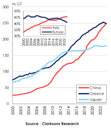 截至8月12日,我國船東所持有的船隊規(guī)模已經(jīng)達(dá)到2.492億總噸,市場份額占比為15.9%(中國船東的船隊價值約為1800億美元),略高于希臘船東的2.490億總噸,市場份額占比15.8%(希臘船東的船隊價值約為1630億美元)。
