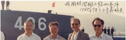 ▲黃旭華(右一)在“406”號(hào)彈道導(dǎo)彈核潛艇前的留影