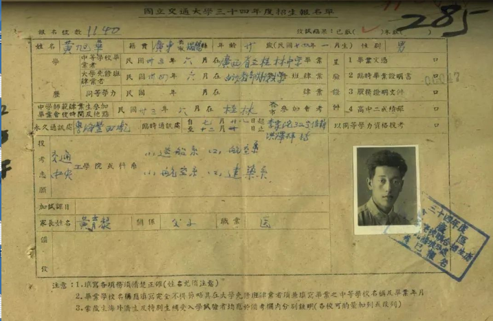 “國(guó)立交通大學(xué)”這所當(dāng)時(shí)在科學(xué)技術(shù)領(lǐng)域全國(guó)首屈一指的學(xué)術(shù)殿堂,在黃旭華心中是神圣而遙遠(yuǎn)的。以至于當(dāng)真正有機(jī)會(huì)填寫被保送大學(xué)的名字時(shí),他竟然沒(méi)有勇氣填上“國(guó)立交通大學(xué)”的名字,只填上了一個(gè)中央大學(xué)的航空系。