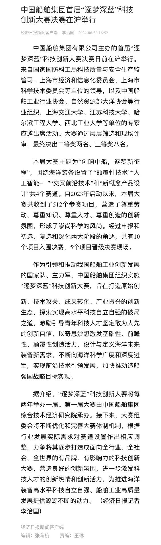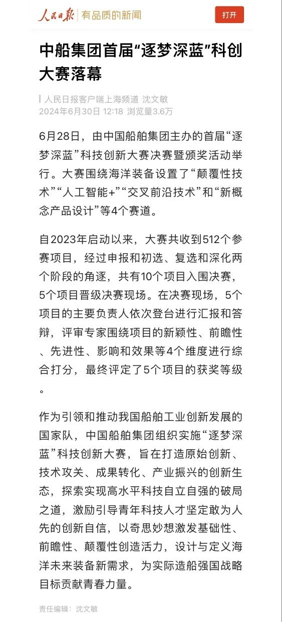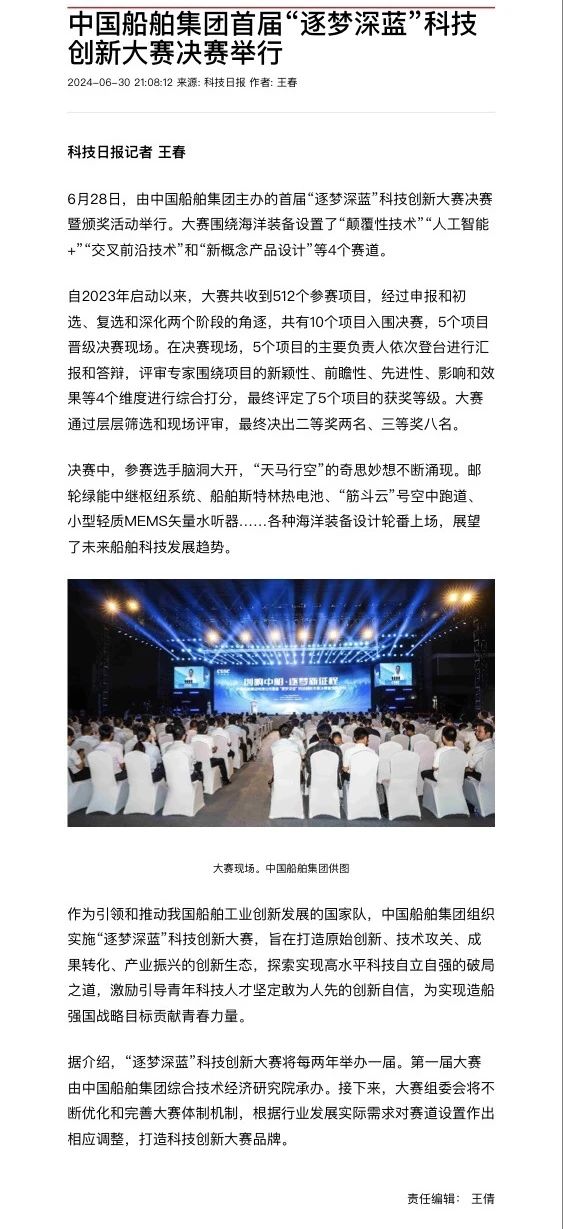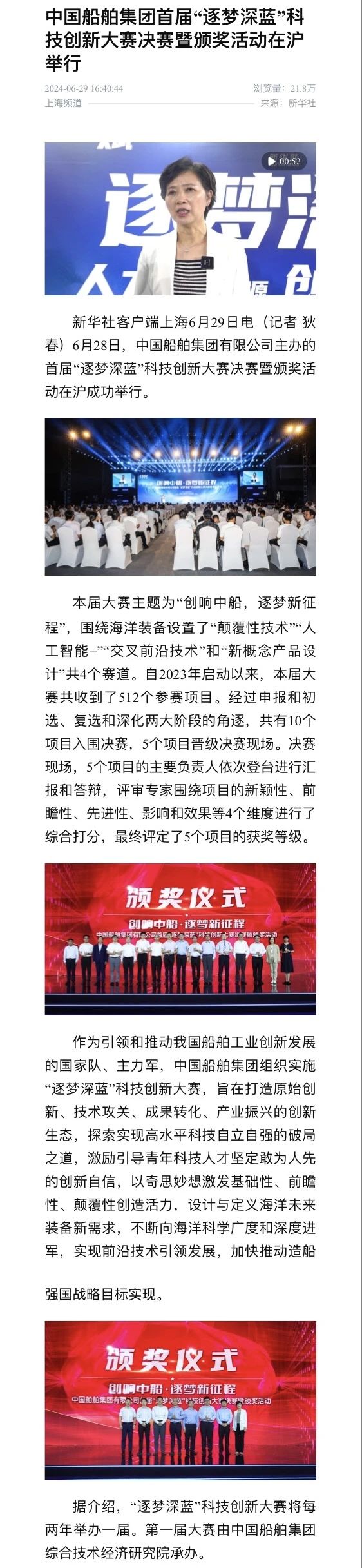 中國(guó)船舶集團(tuán)有限公司主辦的首屆“逐夢(mèng)深藍(lán)”科技創(chuàng)新大賽決賽暨頒獎(jiǎng)活動(dòng)引來(lái)各大媒體的關(guān)注,獲得高度評(píng)價(jià)。——>活動(dòng)回顧