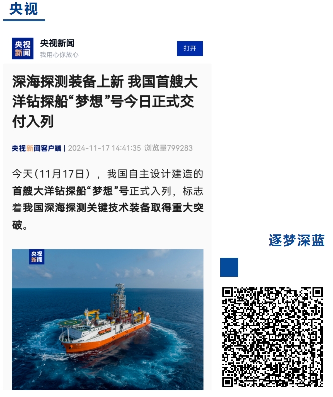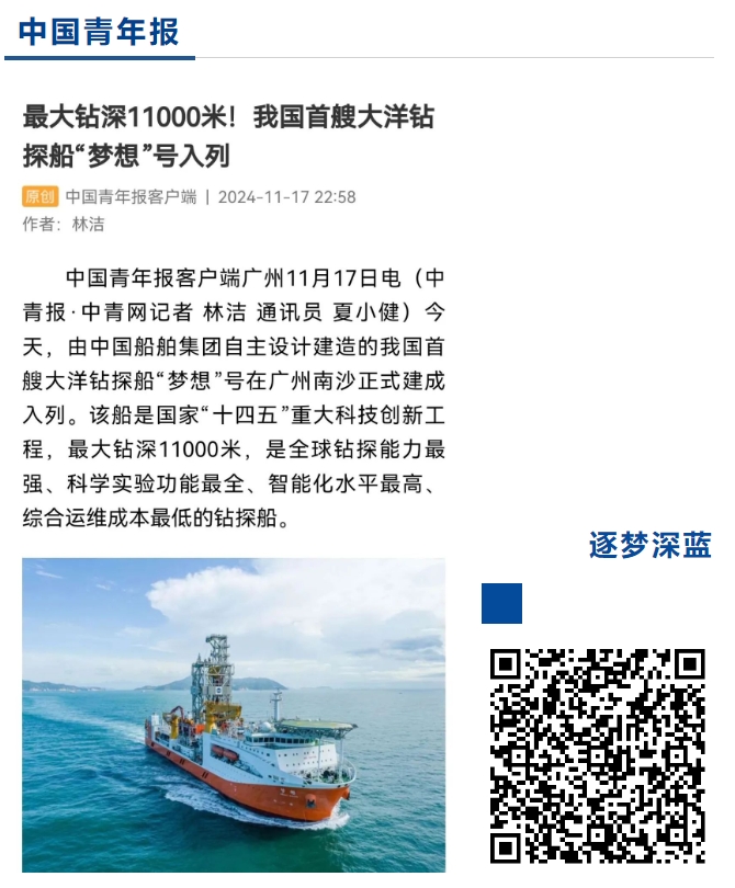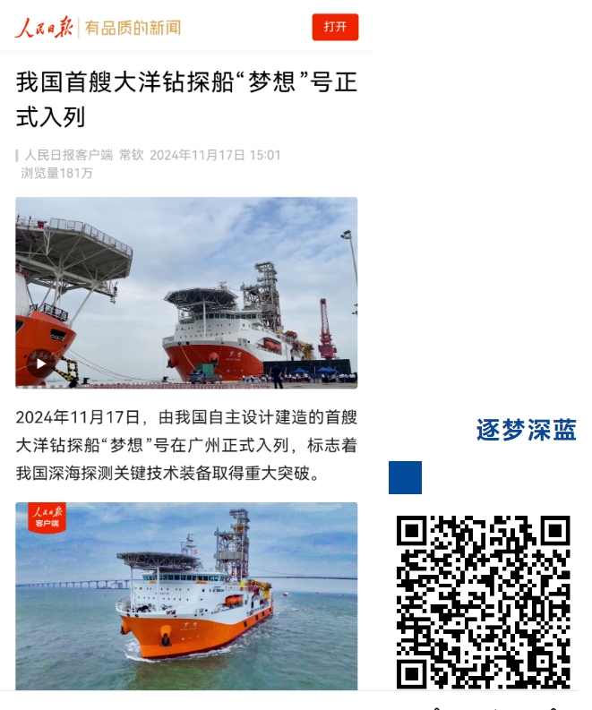 11月17日,中國船舶集團(tuán)自主設(shè)計(jì)建造的我國首艘大洋鉆探船“夢想”號(hào)在廣州南沙交付入列,人民日?qǐng)?bào)、新華社、央視等媒體的記者來到交付現(xiàn)場進(jìn)行報(bào)道 。